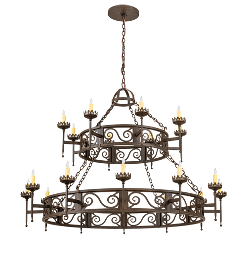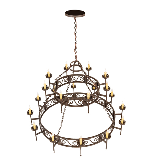 Add a touch of elegance and ambient lighting to your interiors with this sumptuous decorative lighting design. Majella features a stunning Classic Rust finish and is designed to make the perfect centerpiece of any room. An elaborate Hand-Forged Iron scroll design with decorative bobeches embrace 20 Ivory faux candlelights. This lovely chandelier is the perfect centerpiece for a lobby, entryway, ballroom and other spaces. Overall height ranges from 51 to 86 inches as the chain length can be easily adjusted in the field. Handcrafted in our 180,000 square foot manufacturing facility in Yorkville, New York. Diffuser colors, metal finishes and fixture sizes can be customized to your needs. UL and cUL listed for dry and damp locations.