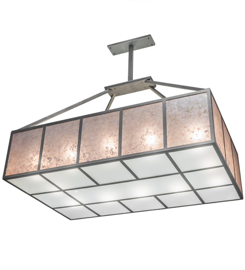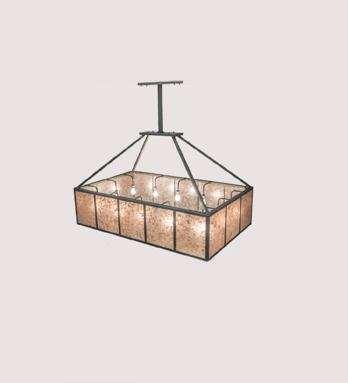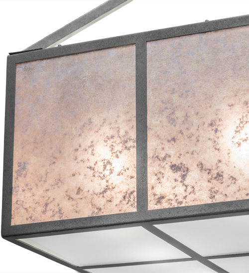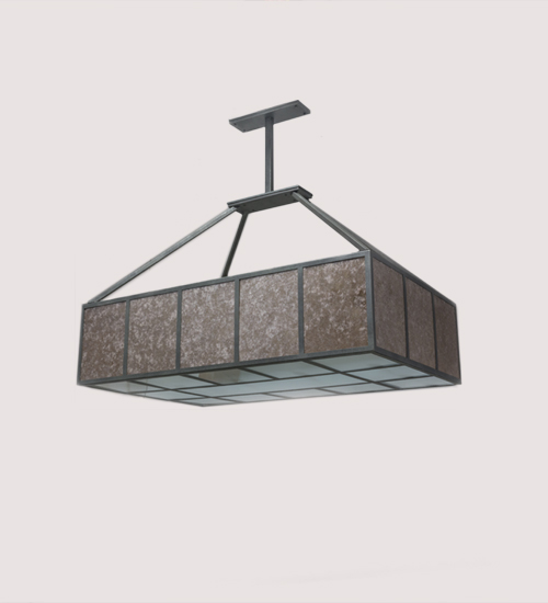 A new transitional classic that adds earthy luxury to residential and commercial settings, this stunning Mission styled pendant is inspired by the Arts & Crafts movement. Kaplan features rich Silver Mica side panels, which are enhanced with a Frosted Glass bottom diffuser. Bold geometric lines, borders and hardware are featured in a Smoke finish. This oblong pendant is perfect for illuminating dining tables, billiard tables, islands and counters in residential and commercial settings. Custom crafted by the hands of artisans in Yorkville, New York. Custom colors, styles and sizes are available. Energy efficient lamping options are offered. This pendant is UL and cUL listed.