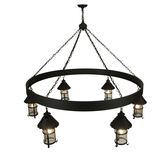 Influenced by cottages and rooftops of storybook characters, six stylized Seedy glass lanterns are suspended by a robust ring powder coated with a Black finish, to complete an evocative impression. The fixture is handcrafted by elves at the foothills of the Adirondack Mountains in Upstate New York. Custom sizes, styles and colors available. Energy efficient lamping options.
