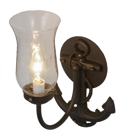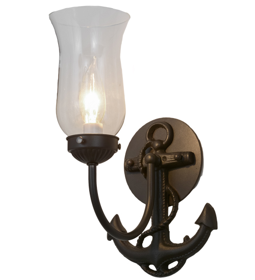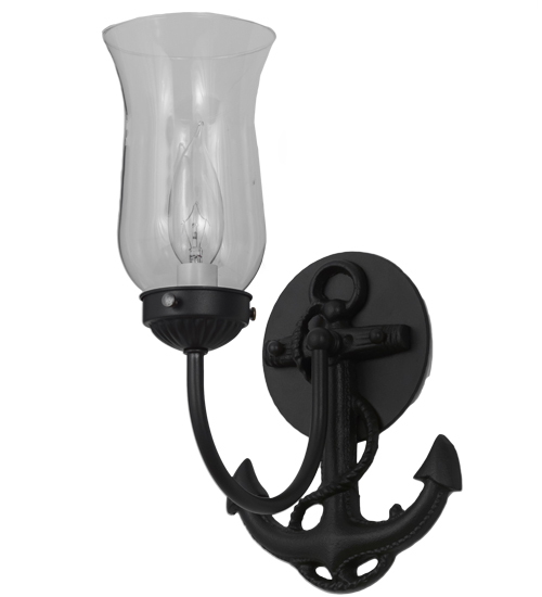 Anchors away. Nautical charm meets traditional styling with this wall sconce. A rugged steel Anchor designed backplate is finished in Wrought Iron and illuminated with a Clear Hurricane styled glass shade. This fixture is custom crafted by artisans in Upstate New York. Custom colors, styles and sizes are available.