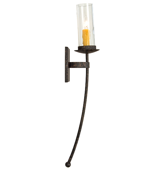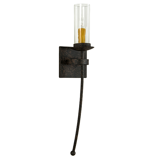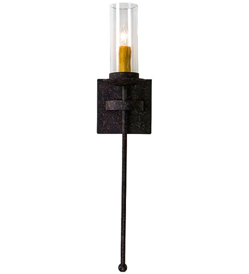 Step back in time with handsome old world styling that greets a distinctive sophisticated look. A Clear glass cylindrical lantern is perched atop of a custom tailored bobeche accented with a long slender decorative stem embellished with a ball tip for a high level of aesthetic appeal. A handsome square backplate is complemented with a curved band. Stunning Solid Steel hardware is hand forged and hand finished in Coffee Bean hue. Ideal for hallways, foyers and other spaces in homes, restaurants, pubs, hotels and other fine interiors. The fixture is custom crafted by artisans in our manufacturing facility in Yorkville, New York.