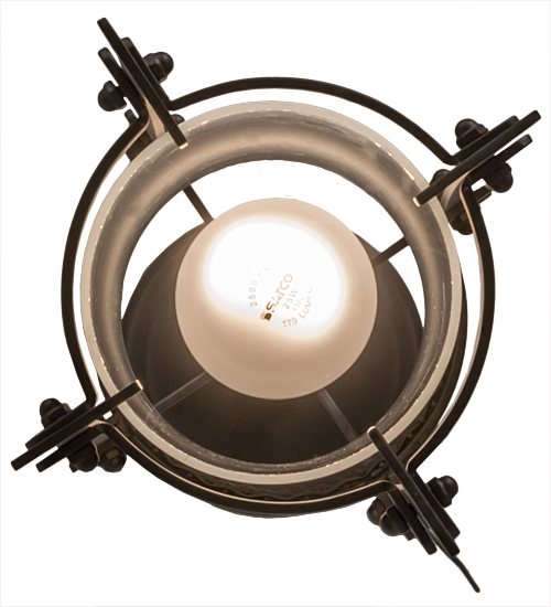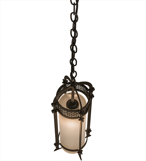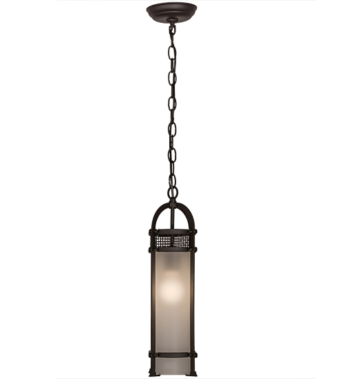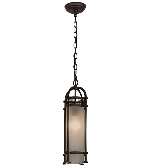A handsome styled Clear Frosted glass cylindrical form is crowned with a caged frame, mesh and hardware which are featured in an Oil Rubbed Bronze finish. Handcrafted in Yorkville, New York, this fixture is available in dimmable energy efficient lamping options, as well as custom sizes, styles and colors.