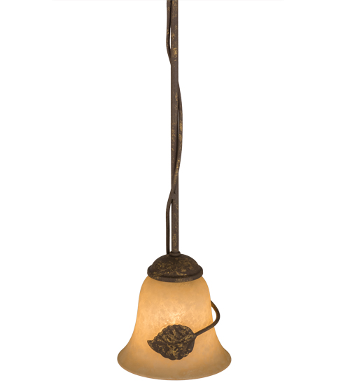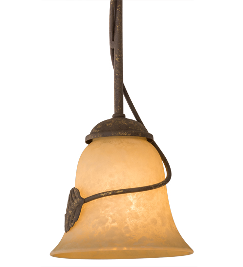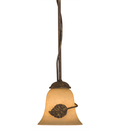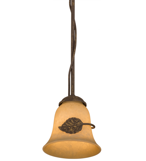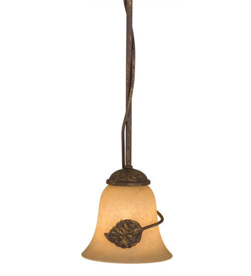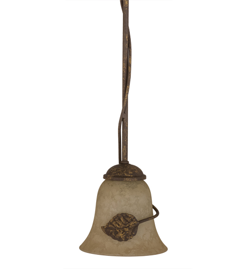 A delicate metal leaf adorns tantalizing Scavo art glass in this bell shaped mini pendant which features decorative hardware in a Pompeii Gold finish. Align these pendants in multiples across a bar, counter, table or island for the most desirable effect. This pendant was handcrafted in the USA. Custom sizes, designs, colors and dimmable energy efficient lamping options are available.