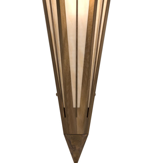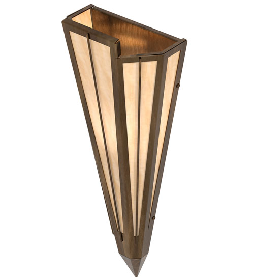 Beige Art Glass is transformed into cool abstract lighting design similar to the famed deco designs showcased in Classic Hollywood theaters. This extraordinary V-shaped sconce is complemented with decorative accents and hardware featured in an Antique Copper finish. Ideal for foyers, corridors and other interiors in homes, home theaters, resorts, hotels and restaurants. Handcrafted by highly skilled artisans in our 180,000 square foot manufacturing facility in Yorkville, New York. Custom colors, styles and sizes are available. Dimmable energy efficient lamping options offered. UL and cUL listed for damp and dry locations.