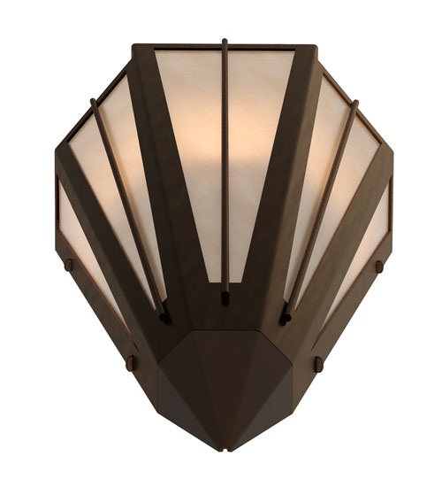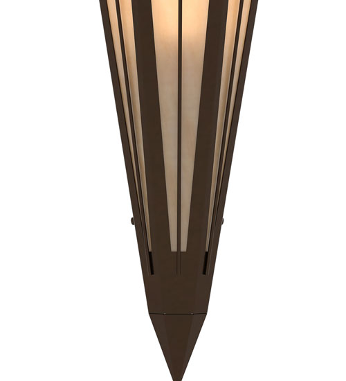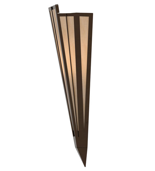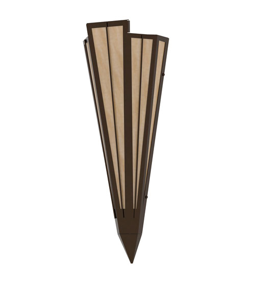 Beige Art Glass is transformed into cool abstract lighting design similar to the famed deco designs showcased in Classic Hollywood theaters. This extraordinary V-shaped sconce is complemented with decorative accents and hardware featured in a Timeless Bronze finish. Ideal for foyers, corridors and other interiors in homes, home theaters, resorts, hotels and restaurants. Handcrafted by highly skilled artisans in our 180,000 square foot manufacturing facility in Yorkville, New York. Custom colors, styles and sizes are available. Dimmable energy efficient lamping options offered. UL and cUL listed for damp and dry locations.