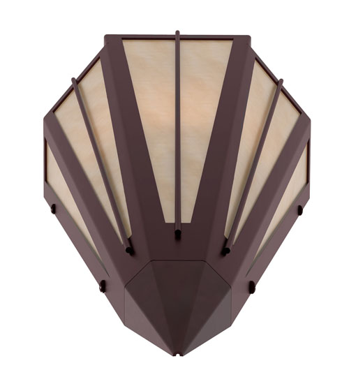 Beige Art Glass is transformed into abstract lighting design similar to the famed deco designs showcased in Classic Hollywood theaters. This extraordinary V-shaped sconce is complemented with decorative accents and hardware featured in a Mahogany Bronze finish. Ideal for foyers, corridors, and other interiors in homes, home theaters, resorts, hotels and restaurants. Handcrafted by highly skilled artisans in our 180,000 square foot manufacturing facility in Yorkville, New York. Custom colors, styles and sizes are available. Dimmable energy efficient lamping options offered. UL and cUL listed for damp and dry locations.
