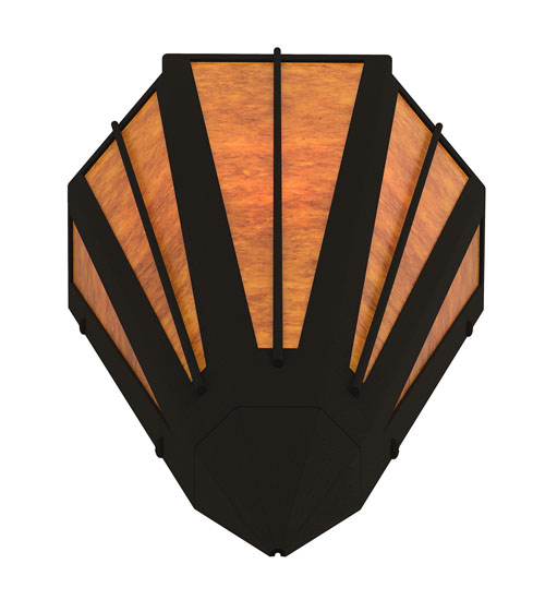 Amber Mica is transformed into abstract lighting design similar to the famed deco designs showcased in Classic Hollywood theaters. This extraordinary V-shaped sconce is complemented with decorative accents and hardware featured in a Textured Black finish. Ideal for foyers, corridors, and other interiors in homes, home theaters, resorts, hotels and restaurants. Handcrafted by highly skilled artisans in our 180,000 square foot manufacturing facility in Yorkville, New York. Custom colors, styles and sizes are available. Dimmable energy efficient lamping options offered. UL and cUL listed for damp and dry locations.