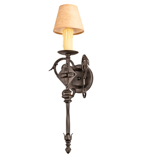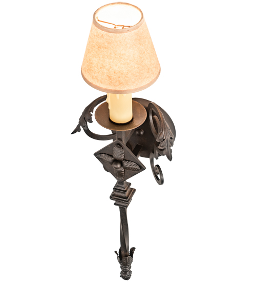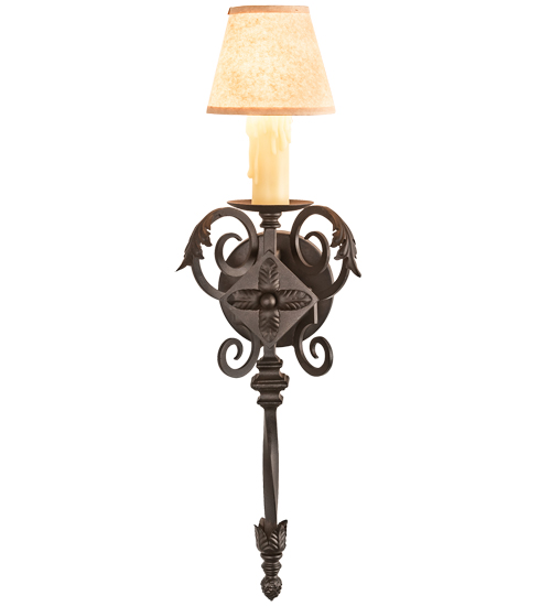 Romantic charm and elegance come to light with the Catherine wall sconce. The fixture is designed as a dramatic accent for any room or corridor. The sconce features an Ivory faux candlelight crowned with a complementary Parchment shade. The shade is enhanced with exquisite scrollwork, acanthus leaves and decorative accents featured in a Chestnut finish. Handcrafted by highly skilled artisans in our 180,000 square foot manufacturing facility. Shade styles, metal finishes and sconce sizes can be customized. UL and cUL listed for dry and damp locations however we do not recommend installing it in spaces that experience a large amount of moisture due to the fabric shade.