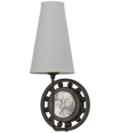 Perfect for any quarters, this unique ship wheel helm styled wall fixture is featured in Distressed Extreme Chrome and enhanced with Timeless Bronze accents and hardware. The single arm wall sconce is crowned with an Off White Textrene cone shaped shade perched on a long slender base. Handcrafted in the USA, this fixture is available in custom styles, colors, sizes and dimmable energy efficient lamping options.