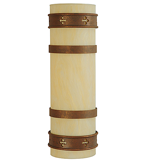Stylized Byzantine Cross insignias adorn the sturdy border of this classic wall fixture. Ideal for interior and exterior applications, this luxurious shade is handcrafted of Sahara Taupe Idalight, graced and complemented with Antique Rust finished hardware. The cylindrical styled sconce is perfect for illuminating living spaces, foyers, conference rooms, lobbies and other spaces. Handmade by highly skilled artisans in the USA. Custom sizes, designs, finishes and dimmable lamping options such as LED are available. The fixture is UL and CUL listed dry, damp and wet locations.