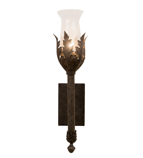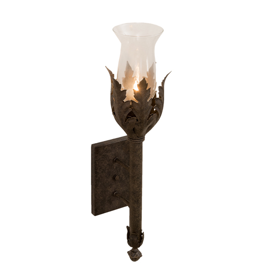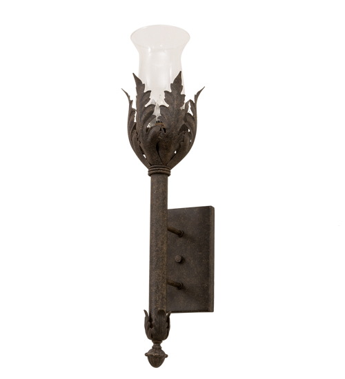 A luxurious sconce design comes to light with elegance and glamour. A faux candlelight covered with a Clear Hurricane Glass shade is perched on a acanthus leaf adorned bobeche. The decorative accents, frame and hardware are featured in an Antiquity finish. This lovely wall fixture is handcrafted in our 180,000 square foot manufacturing facility in Yorkville, New York. Custom sizes, styles, colors and dimmable energy efficient lamping options are available. The sconce is UL and cUL listed for damp and dry locations.