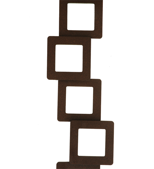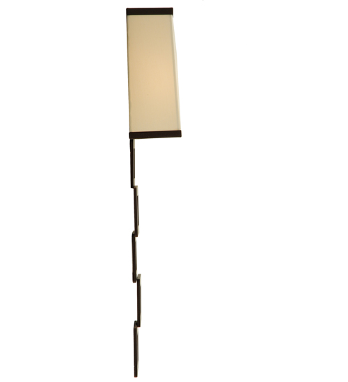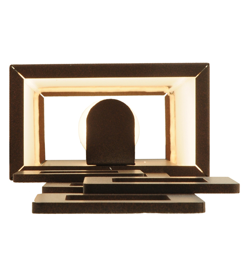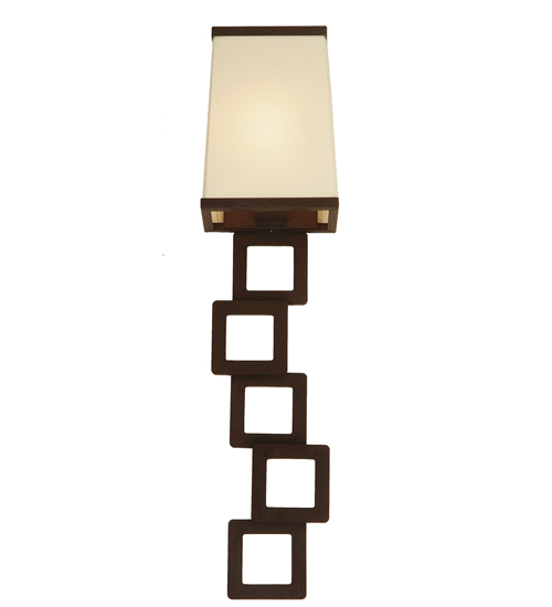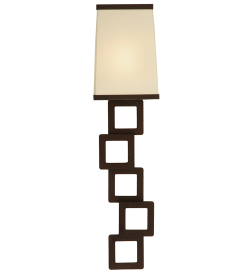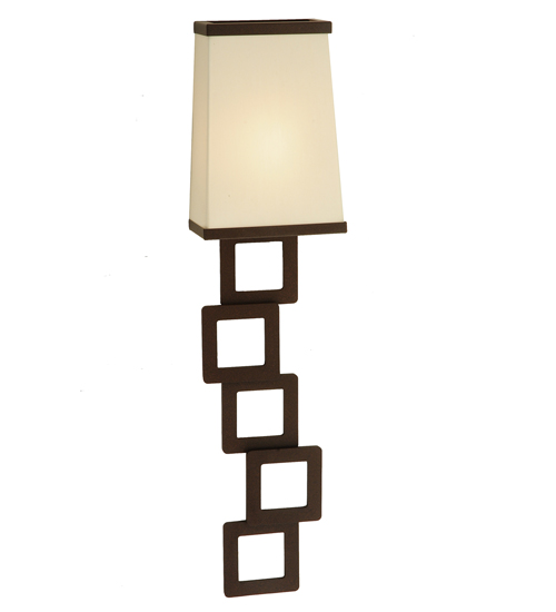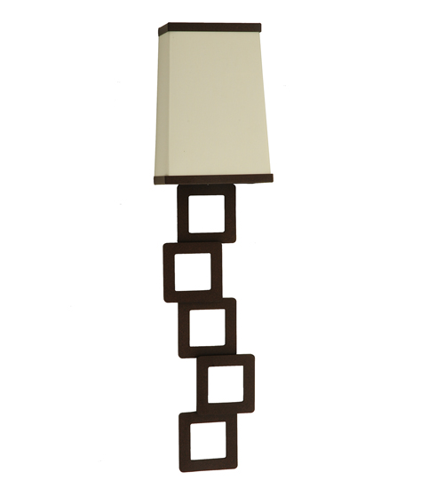 Elegant geometry. A geometric stacked frame features five cube like metal elements in a Cafe Noir finish that are crowned with an Antique Cream Textrene shade. Handmade in the USA, this wall luminaire is available in custom sizes, designs and finishes, as well as dimmable energy efficient lamping options. The 30-inch tall fixture is UL and cUL listed for dry and damp locations.