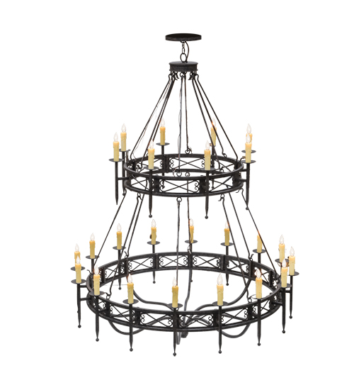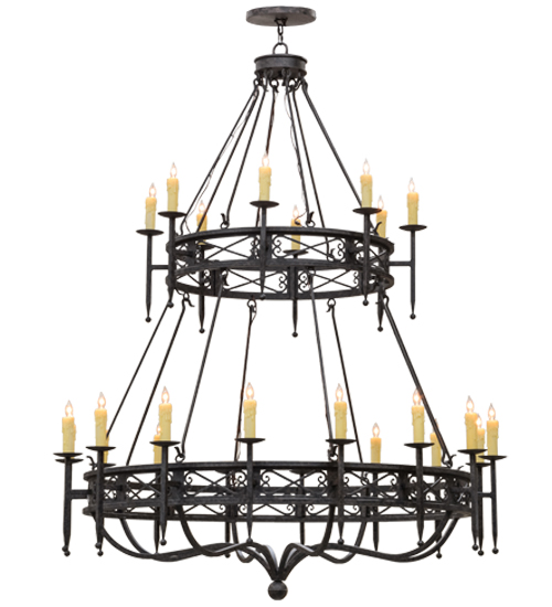 Welcome a handsome revival look into your home or business with the stunning Gina Chandelier, which integrates a distinctive motif with classic styling. 24 Ivory faux candlelights are perched atop bobeches with long ballpoint stems on two decorative rings which are highlighted in a stunning Coffee Bean finish. The Forged Iron chandelier completes an evocative impression with a compelling design and beautiful ambient illumination. Custom crafted in Yorkville, New York by highly skilled artisans, this fixture is available in custom finishes, sizes and colors, as well as dimmable energy efficient lamping options. The two-tier chandelier is UL and cUL listed for damp and dry locations.