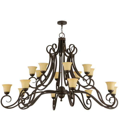 An exquisite chandelier design comes to light with illuminating allure and charm. 16 Beige Scavo Glass shades are perched on bobeches. The shades are embraced by Hand-forged Iron scrolled arms featured in a stunning Classic Rust finish. The overall height ranges from 54 to 101 inches as the chain length can be easily adjusted in the field to accommodate your specific lighting needs. Handcrafted by highly skilled artisans in our 180,000 square foot manufacturing facility in Yorkville, New York. Shade colors, metal finishes and fixture sizes can be customized to your needs. UL and cUL listed for dry and damp locations.