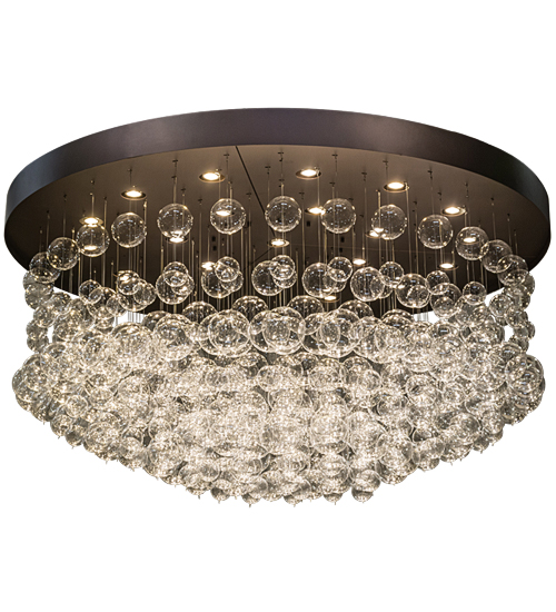 An ethereal, massive centerpiece for any residential, hospitality, or commercial space… This mesmerizing ceiling fixture design comes to light as perfectly formed, sphere-like Crystal Bubbles appear to flow as the light from 22 lamps makes them gleam like magic. The stunning and unique Cilindro Bulle Flushmount features 72 Clear Crystal Miniature Orbs. A handsome hub features a Mahogany Bronze finish with Macadamia-finished accents that support the frame. See this fixture hardware with a distinctive Dark Gold Organza shade, the 72″ Wide Bulle Semi-Flushmount, model 158190. The Bulle Semi-Flushmount is included in our American-made, American-designed Modern Lighting Collection. The eye-catching ceiling fixture is manufactured in Yorkville, New York. It is UL and cUL listed for dry and damp locations.