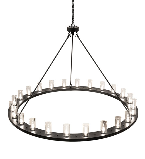 Blending an elegant style with a classic, distinguished look. The massive Loxley Chandelier is custom-crafted with 24 Clear Glass Cylindres on a sturdy round frame featured in a Textured Black finish. The fixture is ideal for illuminating dining tables, conference tables, kitchen islands, and counters. The overall height ranges from 53 to 124 inches, as the chain length easily adjusts in the field to accommodate your specific lighting needs. The Loxley Chandelier is featured in our American-made, American-designed, handcrafted Transitional Lighting Collection. Manufactured in Yorkville, New York. UL and cUL listed for dry and damp locations.