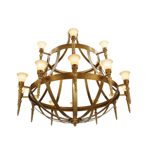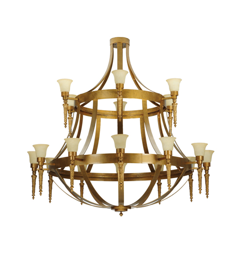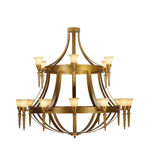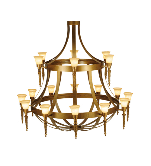 An exquisite, elaborate centerpiece for large spaces, this massive chandelier features eighteen graceful Scavo glass shades adorning the two decorative rings. The two tiers feature Gilded Gold-finished decorative accents and hardware. The elegant chandelier provides beautiful ambient lighting for great rooms and entryways in residential, commercial, and hospitality settings. The Lubovich 18 Light Two Tier Chandelier is included in our American-made, American-designed, handcrafted Gothic Collection and manufactured in Yorkville, NY. It is UL & cUL listed for dry and damp locations.