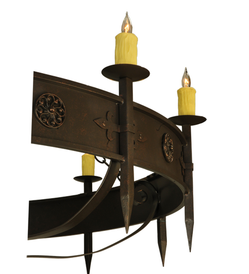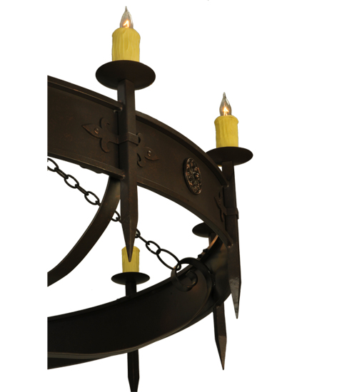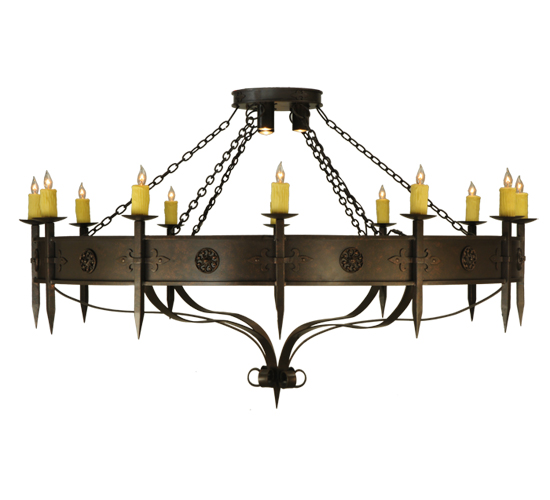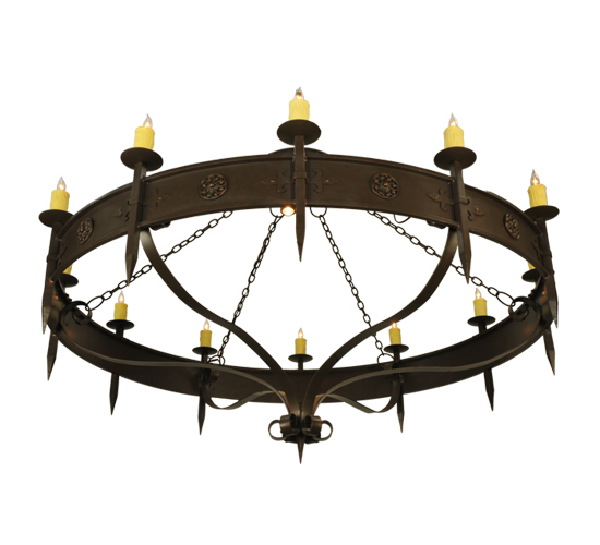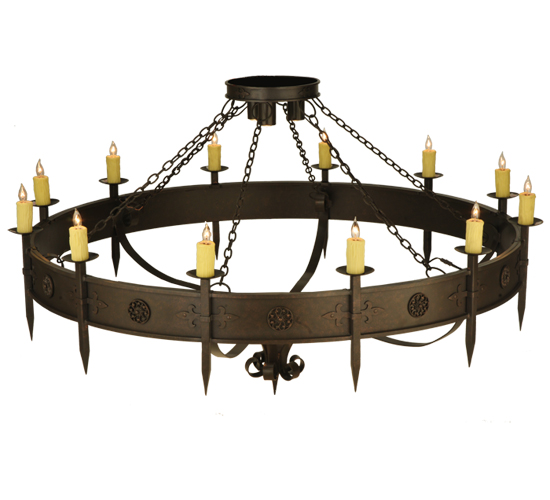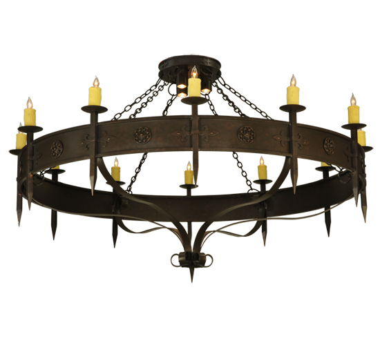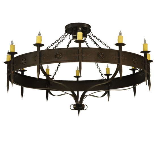 Bring Gothic revival combined with Rustic styling into your home with this elegant Warwick Chandelier. 12 Ivory faux candlelights perched atop bobeches with speartip accents provide beautiful ambient lighting that conjures up images of romanticized bygone days. Designed with Cast Iron Medallions and finished in a Gilded Tobacco hue. Three customer-supplied functional downlights embrace the canopy above while delivering functional task lighting on surfaces below. Custom crafted by highly skilled artisans in our 180,000 square foot manufacturing facility in Yorkville, New York. Candlelight colors, metal finishes and chandelier sizes can be customized. UL and cUL listed for dry and damp locations.