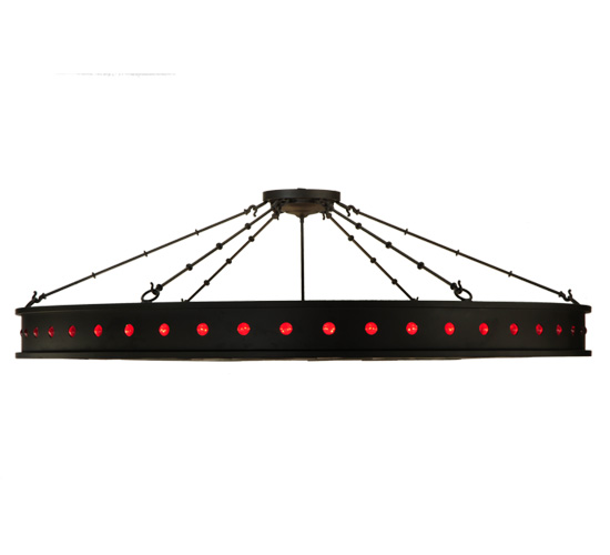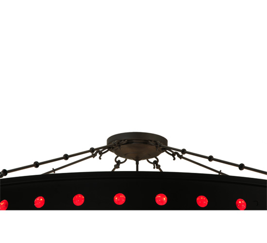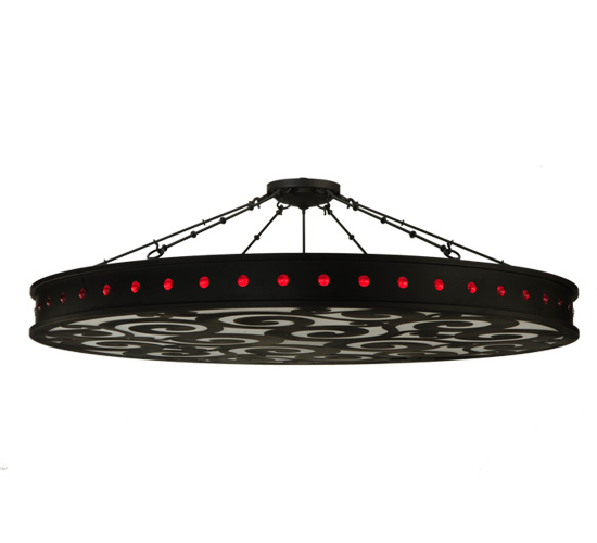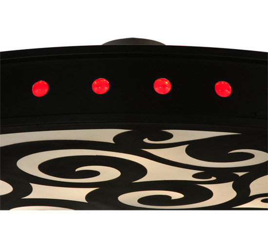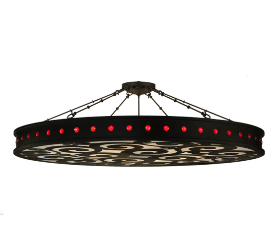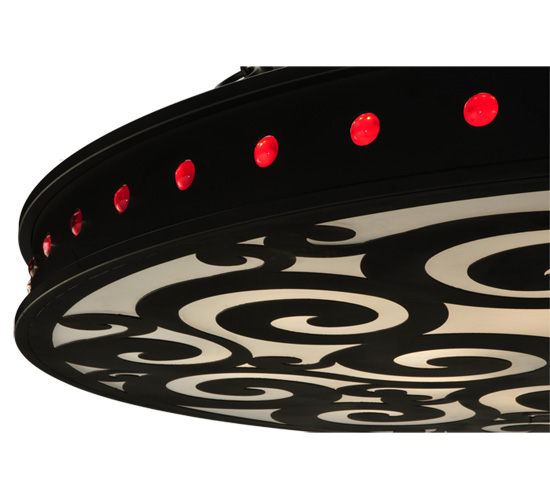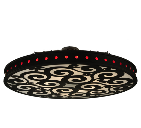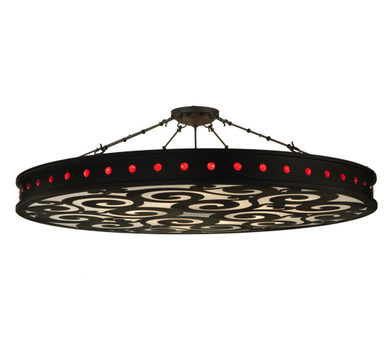 Jules is a ceiling fixture that offers a unique scrolled bottom design with accents that light up brilliantly and are complemented with Ruby Red colored jewels around the perimeter. The round Iron frame in an Oil Rubbed Bronze finish embraces a Statuario Idalight diffuser for soft ambient lighting. Handcrafted by highly skilled artisans in our manufacturing facility in Upstate New York, this transitional styled fixture is available in a wide range of custom choices including various designs, colors, sizes and dimmable energy efficient lamping options such as LED. The fixture is UL and cUL listed for damp and dry locations.
