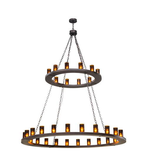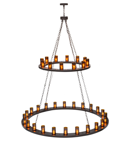 Replicating an old world lighting fixture found in castles and cathedrals of bygone days, this exquisite chandelier features 36 cylindrical Amber glass Cylindres on the two tiers of this chandelier. 10 Are displayed on the upper ring while 26 lights are featured on the larger lower ring. All hardware is hand finished in Mahogany Bronze. Custom crafted by highly skilled artisans in our 180,000 square foot manufacturing facility in Yorkville, New York, in the USA. Options include dimmable energy efficient lamping such as LED, as well as custom sizes, styles and colors. UL and cUL listed for damp and dry locations.