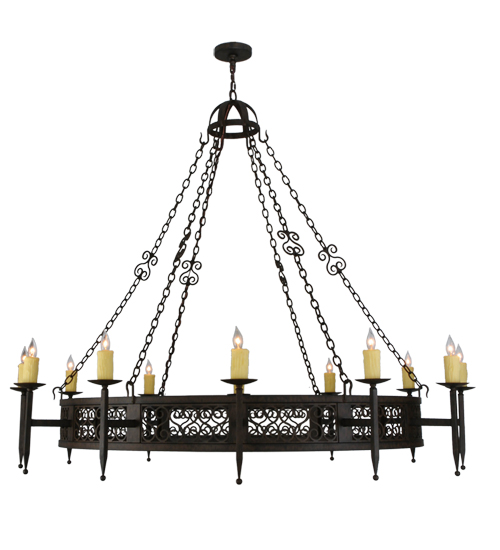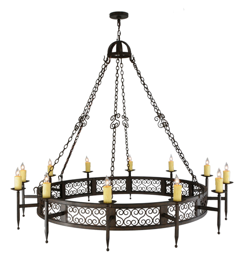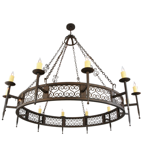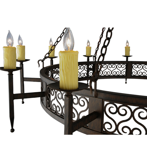 An exquisite chandelier design comes to light with all of the sparkle of a regal castle, conjuring up images of romantic bygone days. 12 Ivory faux candlelights perched on bobeches with ballpoint accents are embraced by linear arms with scroll accents. The authentic frame and hardware that supports this fixture are featured in a Classic Rust finish.Handcrafted in the USA, custom sizes, styles, colors and dimmable energy efficient lamping options such as LED are available. UL and cUL listed for damp and dry locations.