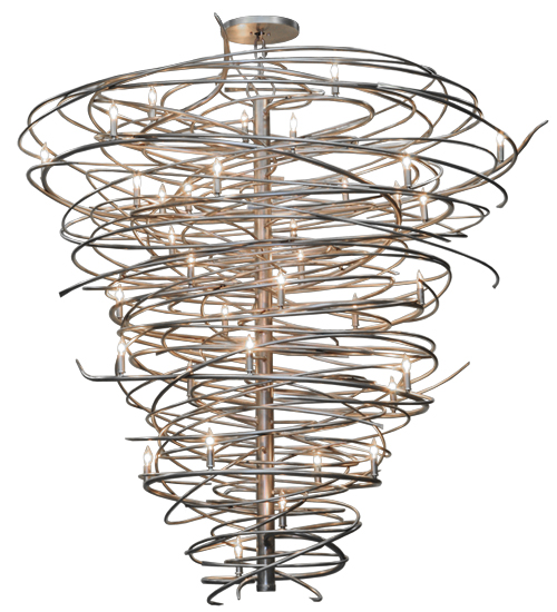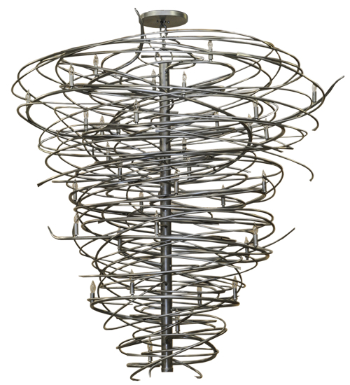 The bold, eye-catching Cyclone simulates whirling winds of energy and gyration with twisting steel that is accentuated with 36 delicately placed beacons to help you weather the storm. The winding mass of steel surrounds a sturdy post, all featured in our Pewter finish. Make an impressive design statement that will wow guests in lobbies, conference rooms, entryways and other residential and commercial spaces. The fixture is handcrafted by master artisans in our Upstate New York manufacturing facility. Custom designs, styles, sizes and dimmable energy efficient lamping such as LEDs are available. This chandelier is UL and cUL listed for damp and dry locations.