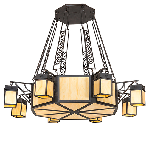 Evoking a dramatic transitional look, the stunning Azrael Chandelier features an octagon shaped Tawnyrock Idalight diffuser in its center, with 8 complementary cube-shaped shades offered in the same diffuser material and hue.Each appealing shade is accented with a scrolled medallion to complement the intricate scroll filigree on the arms, with the solid frame and hardware featured in a warm Chestnut finish. Beautiful ambient illumination is provided by 16 Customer supplied, PL 26-watt Fluorescent lamps. Custom crafted in the USA, this striking chandelier is available in custom colors, designs and sizes, as well as dimmable energy efficient lamping options such as LED. The Grand styled, fixture is UL and cUL listed for damp & dry locations.