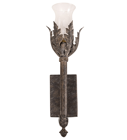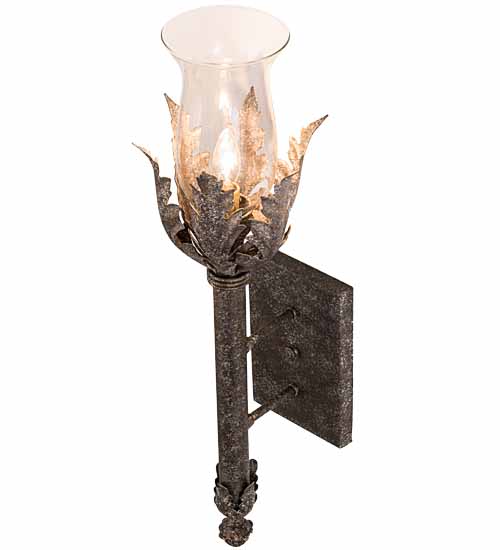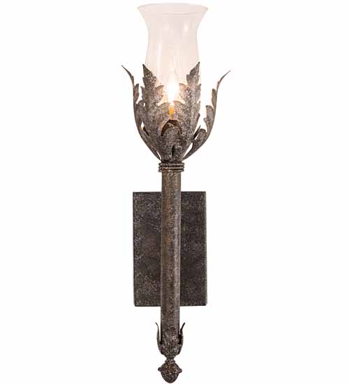 A Clear Hurricane Glass Shade reveals an Ivory faux candlelight embraced by an exquisite bobeche which is adorned with Acanthus Leaf metal accents. The frame, decorative finial and hardware are featured in a stunning Ash finish. The 24-inch long wall sconce is handcrafted in Yorkville, NY. Custom sizes, styles and finishes are available as well as dimmable energy efficient lamping options such as LED. UL and cUL listed for dry and damp locations.