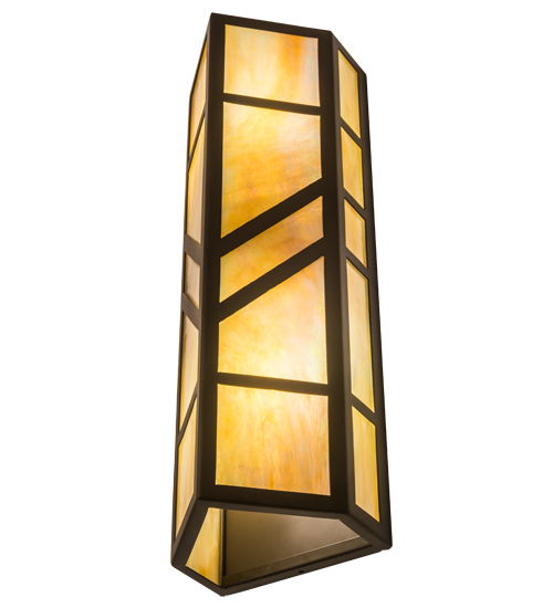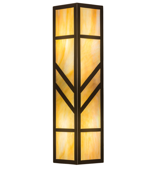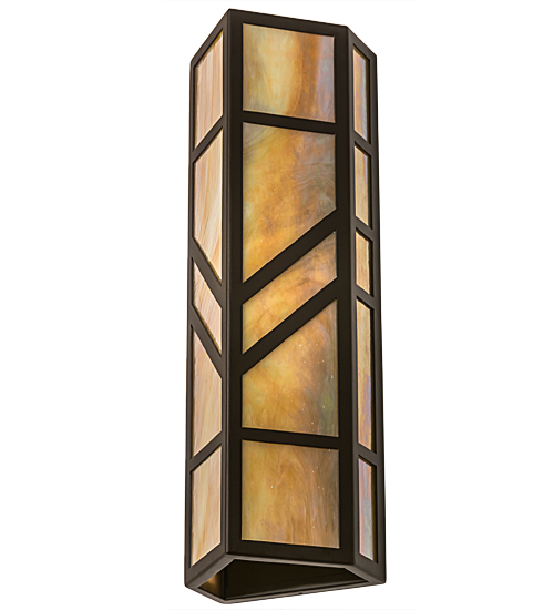With a striking southwestern Mission styled design, emerges the stunning Santa Fe wall sconce. A charming aura projects from Beige Iridescent art glass diffuser with bold geometric styling. Complemented with an Oil Rubbed Bronze finished frame and hardware, this handcrafted wall fixture is ideal for ambient decorative lighting in a corridor or any room where you want to make a bold design statement. The fixture illuminates with 2 Customer supplied, Medium base LED A19 lamps. Handmade in the USA, this sconce is available in custom designs, colors and sizes, as well as with dimmable energy efficient lamping such as LED. The 7-inch wide sconce is UL and cUL listed for damp and dry locations.