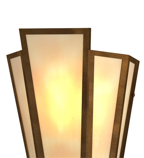 Beige Art Glass is transformed into an abstract lighting design similar to the famed deco designs showcased in Classic Hollywood theaters. This extraordinary V-shaped sconce is complemented with decorative accents and hardware featured in an Antique Copper finish. The fixture is ideal for foyers, corridors and other interiors in homes, home theaters, resorts, hotels and restaurants. Handcrafted by highly skilled artisans in our 180,000 square foot manufacturing facility in Yorkville, New York. Custom colors, styles and sizes are available. Dimmable energy efficient lamping options offered. UL and cUL listed for damp and dry locations.