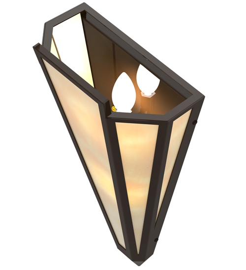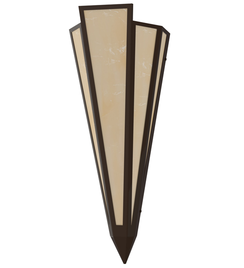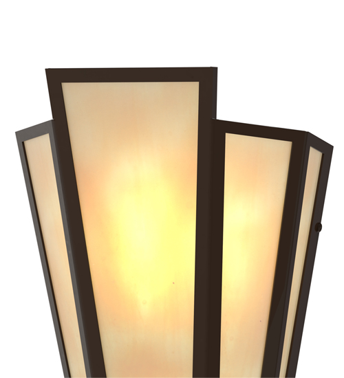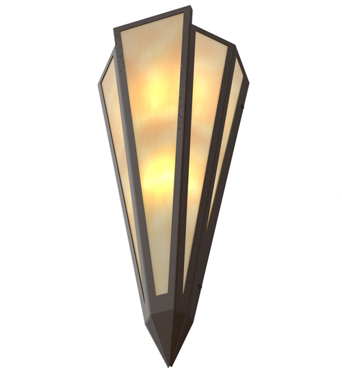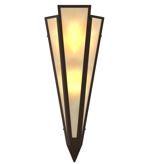 Beige Art Glass is transformed into an abstract lighting design similar to the famed deco designs showcased in Classic Hollywood theaters. This extraordinary V-shaped sconce is complemented with decorative accents and hardware featured in a Timeless Bronze finish. The fixture is ideal for foyers, corridors and other interiors in homes, home theaters, resorts, hotels and restaurants. Handcrafted by highly skilled artisans in our 180,000 square foot manufacturing facility in Yorkville, New York. Custom colors, styles and sizes are available. Dimmable energy efficient lamping options offered. UL and cUL listed for damp and dry locations.