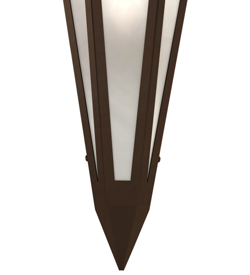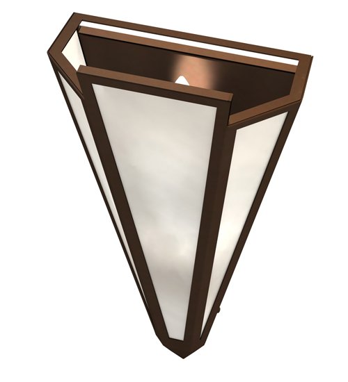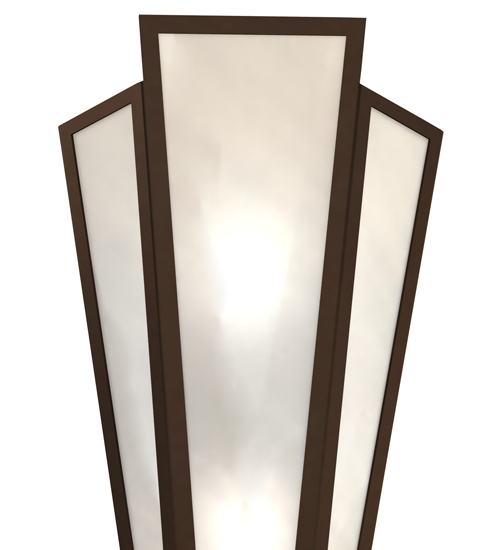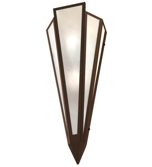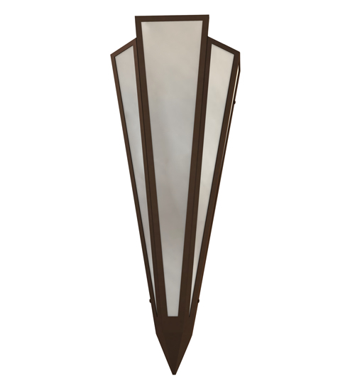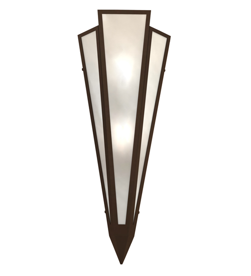 White Art Glass is transformed into abstract lighting design similar to the famed deco designs showcased in Classic Hollywood theaters. This extraordinary V-shaped sconce is complemented with decorative accents and hardware featured in a Timeless Bronze finish. Ideal for foyers, corridors and other interiors in homes, home theaters, resorts, hotels and restaurants. Handcrafted by highly skilled artisans in our 180,000 square foot manufacturing facility in Yorkville, New York. Custom colors, styles and sizes are available. Dimmable energy efficient lamping options offered. UL and cUL listed for damp and dry locations.