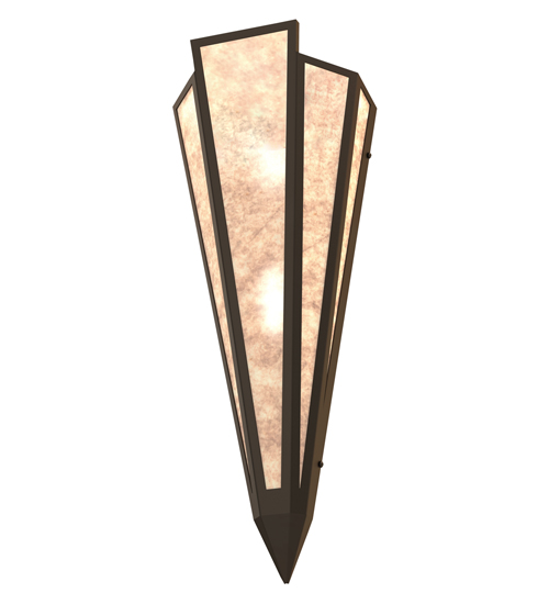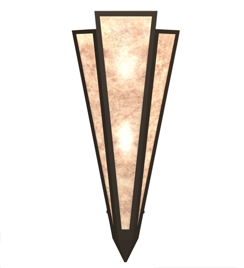 Silver Mica is transformed into cool abstract lighting design similar to the famed deco designs showcased in Classic Hollywood theaters. This extraordinary V-shaped sconce is complemented with decorative accents and hardware featured in an Oil Rubbed Bronze finish. Ideal for foyers, corridors and other interiors in homes, home theaters, resorts, hotels and restaurants. Handcrafted by highly skilled artisans in our 180,000 square foot manufacturing facility in Yorkville, New York. Custom colors, styles and sizes are available. Dimmable energy efficient lamping options offered. UL and cUL listed for damp and dry locations.