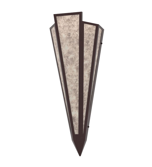 Silver Mica is transformed into cool abstract lighting design similar to the famed deco designs showcased in Classic Hollywood theaters. This extraordinary V-shaped sconce is complemented with decorative accents and hardware featured in a Mahogany Bronze finish. Ideal for foyers, corridors and other interiors in homes, home theaters, resorts, hotels and restaurants. Handcrafted by highly skilled artisans in our 180,000 square foot manufacturing facility in Yorkville, New York. Custom colors, styles and sizes are available. Dimmable energy efficient lamping options offered. UL and cUL listed for damp and dry locations.