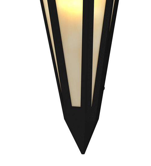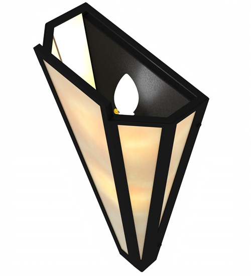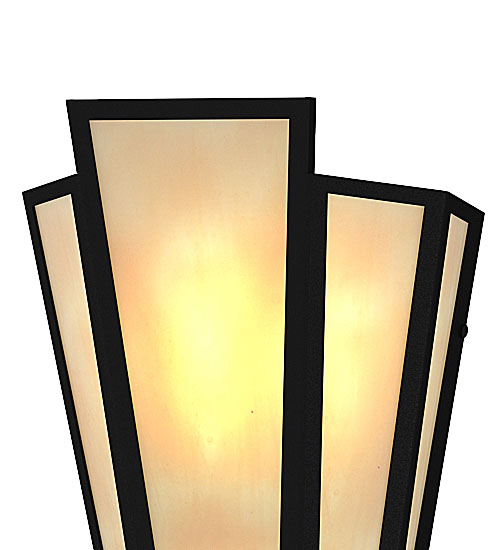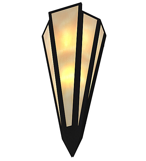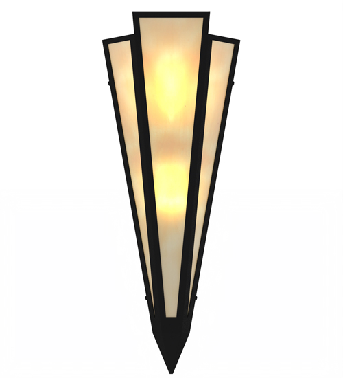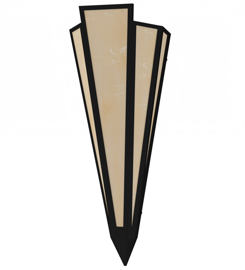 Beige Art Glass is transformed into an abstract lighting design similar to the famed deco designs showcased in Classic Hollywood theaters. This extraordinary V-shaped sconce is complemented with decorative accents and hardware featured in a Textured Black finish. The fixture is ideal for foyers, corridors and other interiors in homes, home theaters, resorts, hotels and restaurants. Handcrafted by highly skilled artisans in our 180,000 square foot manufacturing facility in Yorkville, New York. Custom colors, styles and sizes are available. Dimmable energy efficient lamping options offered. UL and cUL listed for damp and dry locations.