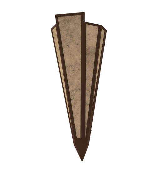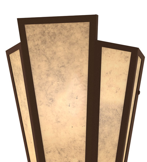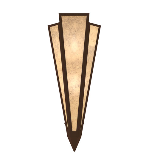 Silver Mica is transformed into an absrtact lighting design similar to the famed deco designs showcased in Classic Hollywood theaters. This extraordinary V-shaped sconce is complemented with decorative accents and hardware featured in a Cafe Noir finish. The fixture is ideal for foyers, corridors and other interiors in homes, home theaters, resorts, hotels and restaurants. Handcrafted by highly skilled artisans in our 180,000 square foot manufacturing facility in Yorkville, New York. Custom colors, styles and sizes are available. Dimmable energy efficient lamping options offered. UL and cUL listed for damp and dry locations.