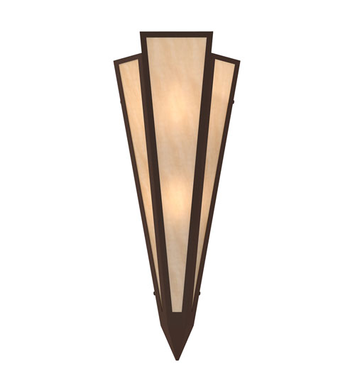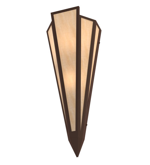Beige Art Glass is transformed into an abstract lighting design similar to the famed deco designs showcased in Classic Hollywood theaters. This extraordinary V-shaped sconce is complemented with decorative accents and hardware featured in a Cafe Noir finish. The fixture is ideal for foyers, corridors and other interiors in homes, home theaters, resorts, hotels and restaurants. Handcrafted by highly skilled artisans in our 180,000 square foot manufacturing facility in Yorkville, New York. Custom colors, styles and sizes are available. Dimmable energy efficient lamping options offered. UL and cUL listed for damp and dry locations.