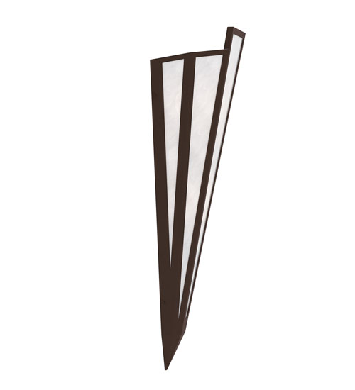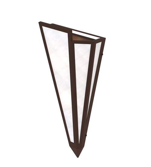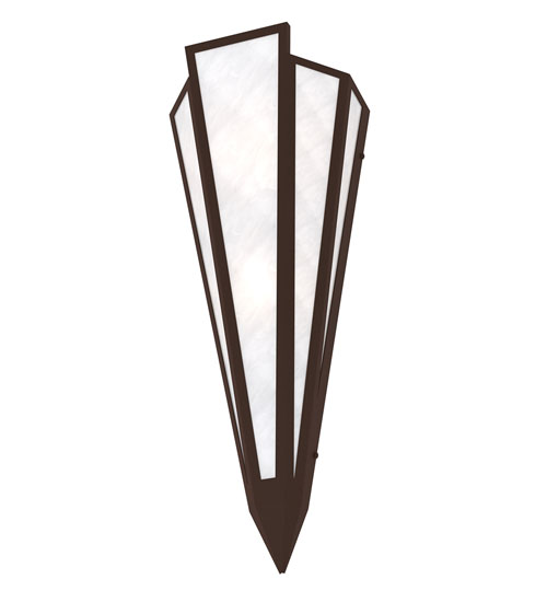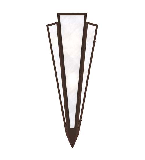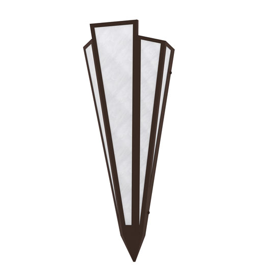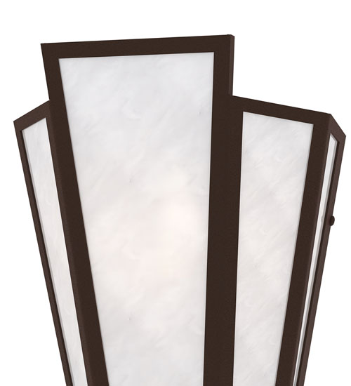 White Art Glass is transformed into an abstract lighting design similar to the famed deco designs showcased in Classic Hollywood theaters. This extraordinary V-shaped sconce is complemented with decorative accents and hardware featured in a Cafe Noir finish. The fixture is ideal for foyers, corridors and other interiors in homes, home theaters, resorts, hotels and restaurants. Handcrafted by highly skilled artisans in our 180,000 square foot manufacturing facility in Yorkville, New York. Custom colors, styles and sizes are available. Dimmable energy efficient lamping options offered. UL and cUL listed for damp and dry locations.