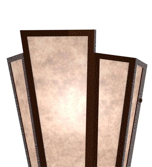 Silver Mica is transformed into abstract lighting design similar to the famed deco designs showcased in Classic Hollywood theaters. This extraordinary V-shaped sconce is complemented with decorative accents and hardware featured in a Sepia Brown finish. Ideal for foyers, corridors and other interiors in homes, home theaters, resorts, hotels and restaurants. Handcrafted by highly skilled artisans in our 180,000 square foot manufacturing facility in Yorkville, New York. Custom colors, styles and sizes are available. Dimmable energy efficient lamping options offered. UL and cUL listed for damp and dry locations.