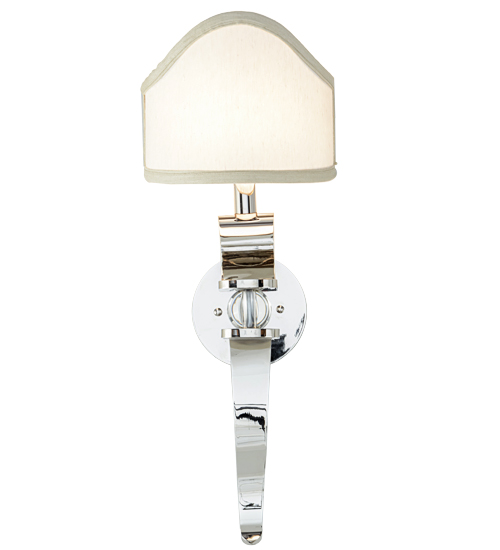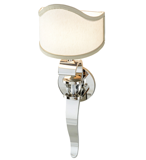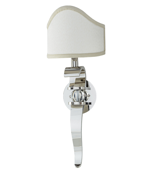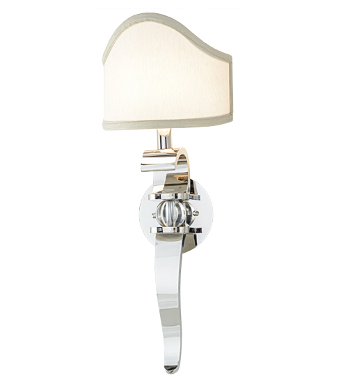 A glamorous, curvy beauty, blending classic and retro styles and tastes. This camel back styled Beige fabric shade adorns a Solid Brass base and backplate finished in Polished Nickel, with a Clear glass ball for a clean decorative look. With its streamlined elegance, this sconce is the perfect choice for today’s interiors. The fixture makes a finishing touch in living areas, entryways, hallways and more. Handcrafted in the manufacturing facility in Yorkville, New York.