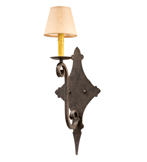 Rich charm and elegance come to light with Angelique. This wall sconce is designed as a dramatic accent for any other room. The enchanting fixture features an Ivory faux candlelight crowned with a Taos Parchment Shade. The shade is perched on a bobeche, with a Hand Forged Iron scrolled arm & stylized diamond shaped hardware featured in an Antiquity finish. This lovely wall fixture is handcrafted in our 180,000 square foot manufacturing facility in Yorkville, New York. Shades styles and metal finishes can be customized to your needs. UL and cUL listed for damp and dry locations. UL & cUL listed for dry and damp locations, however, we do not recommend installing it in spaces that experience a large amount of moisture due to the fabric shade.