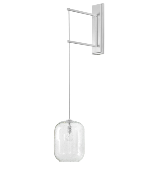 Pastilla evokes a soft, calming, soothing effect. This hanging wall sconce features a uniquely shaped Clear Seeded Glass shade, revealing an Edison-styled lamp and embraced by a geometric-styled arm. The unique wall sconce offers a frame and hardware featured in a Gloss White finish. Ideal for various corridors and other rooms in residential and commercial environments. The Pastilla Wall Sconce is included in our American-made, American-designed, handcrafted Modern Lighting Collection. Manufactured in Yorkville, NY. UL & cUL listed for dry and damp locations.