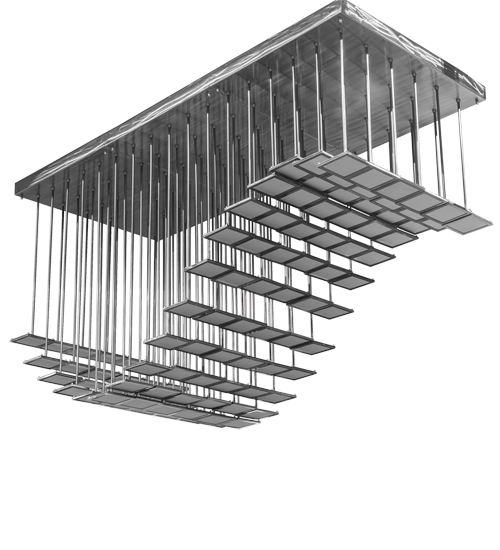 A massive modern chandelier using the latest Integral Organic Light Emitting Diode (OLED) nanotechnology. The dimmable Kossar luminaire is created with 102 unique Integral OLED ultra thin panels- all delivering energy efficient 4000K illumination without glare from a flat light source. This luminaire combines three smaller fixtures: model 216323 26″” Long Kossar, model 216326 27″” Long Kossar and model 216328 27″” Long Kossar fixtures. The hardware, decorative accents and frame are featured in a stunning Alloy Wheel Clear Coat finish. Custom crafted in our 180,000 square foot manufacturing facility in Yorkville, New York. OLED panels, metal finishes and fixture sizes can be customized. Contact us for additional sustainable OLED lighting solutions.
