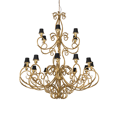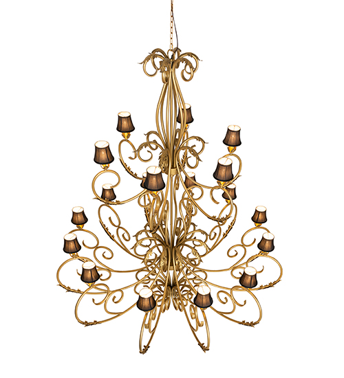 Defining luxurious charm and elegance, Alexandria features an elaborate design with scrolled arms and acanthus leaf accents in a stunning Spanish Gold finish. Two tiers of graceful faux candlelights crowned with Black Trumpet Shades, 18 in total, are perched on floral bobeches. American artistry is perfected by years of time honored artistry, passed down generations of master artisans. Custom crafted in the USA, this chandelier is available in custom sizes, styles, and colors, as well as dimmable energy efficient lamping options. This 84-inch wide fixture is UL and cUL listed for dry and damp locations however we do not recommend installing it in spaces that experience a large amount of moisture.