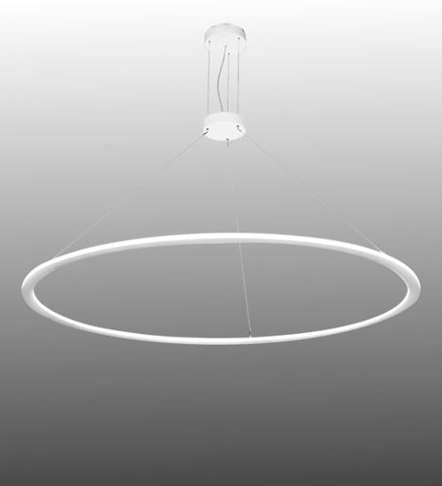 A modern sophisticated pendant featuring a spectral halo of ambient light. Our powered suspension feed is engineered with low voltage spacecraft cables for balance and precision. This Gloss White powder coated ring reveals a Contrail Mist Idalight diffuser. Integral dimmable LEDs deliver energy savings, minimal maintenance and long life. The overall height ranges from 25 to 138 inches as the cable length can be easily adjusted in the field to accommodate your specific lighting application needs. Handcrafted by skilled artisans in our 180,000 square foot manufacturing facility in Yorkville, New York. Diffuser colors, metal finishes and fixture sizes can be customized to your needs.