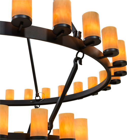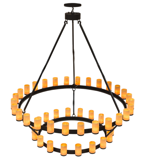 Blending an elegant style with a rich distinguished look, this Noziroh Chandelier features two Black Textured steel rings that provide timeless beauty and abundant overall illumination. Large rugged arms, designed with a decorative twist, support the rings from the ceiling. A total of 46 Tawnyrock Idalight Cylindres are mounted on the two tiered structure, each perched on a holder attached with an arm to a ring. 28 Luminaires are displayed from the top ring while 18 are attached to the lower ring. Ideal for illuminating dining areas, conference tables, lobbies and other residential and commercial spaces. Handcrafted in our 180,000 square foot manufacturing facility in Yorkville, New York. UL and cUL listed for dry and damp locations.