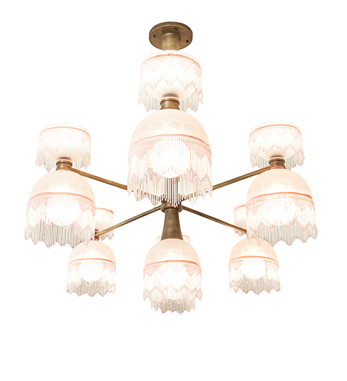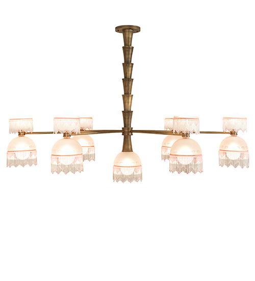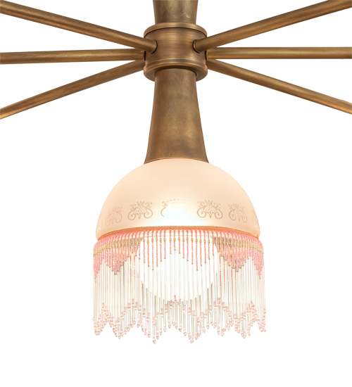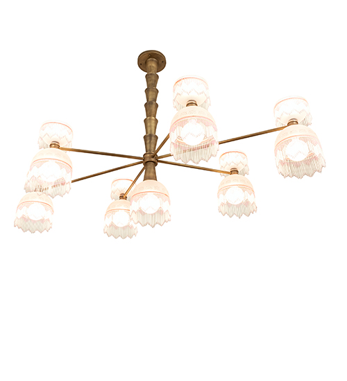 This upscale Lex Chandelier is designed and engineered with 6 Dome Shaped Pink and White Mottled Glass shades crowned with open styled glass shades. All shades are complemented with color coordinated glass fringe perched on linear arms. A single diffuser doubles as a finial at the center of the fixture. The architecturally styled stem features stacked cone shaped accents. The Matte Brass finish is a Hand Applied Patina that reveals the stunning beauty and antique richness of exquisite Solid Brass that is distinguished without looking dated or too shiny, for a subtle yet warm effect. Custom Crafted in our 180,000 sq ft manufacturing facility in Yorkville, NY. UL and cUL listed for dry and damp locations.
