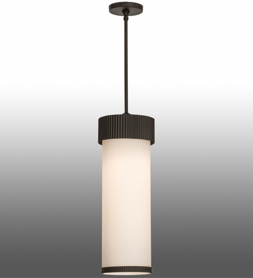 A clean transitional look is achieved with this smartly designed, cylindrical shaped pendant. White glass is topped with a corrugated steel crown and matching lower trim, that are complemented with Oil Rubbed Bronze finished hardware. Custom crafted at the facility in Upstate New York. Custom sizes, styles and colors are available, as well as dimmable energy efficient lamping options.