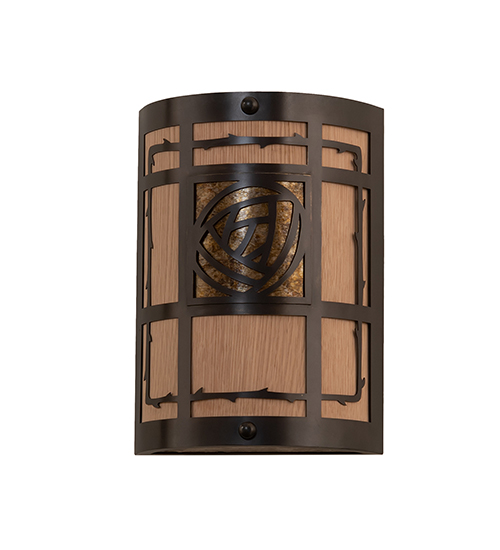 An abstract Bungalow Rose motif in Silver Mica is the focus of this stunning Brass wall sconce. Surrounding the Rose design is an Amber Mica lens with a Birch Veneer and a Golden Oak Stain. The wall fixture is enhanced with a matching Silver Mica bottom diffuser and a handsome curvaceous frame featuring a geometric pattern in a Craftsman Brown finish.The Bungalow Rose Wall Sconce is included in our American-made, American-designed, handcrafted Nature-Inspired Lighting Collection. Manufactured in Yorkville, New York. UL and cUL listed for dry and damp locations.