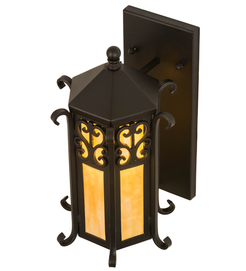 Grand stature and an ornate hand-forged metalwork create a rich luxurious look for Caprice. This high-styled wall fixture features Beige Art Glass which is enhanced with a scroll design and decorative accents featured in a bold Textured Black finish. This classic sconce is ideal to complement a variety of architectural styles for today’s exteriors and interiors. Custom crafted in the USA, this fixture is offered in custom sizes, finishes, and styles, as well as energy efficient lamping options such as LED. The wall sconce is UL and cUL listed for dry and wet locations.